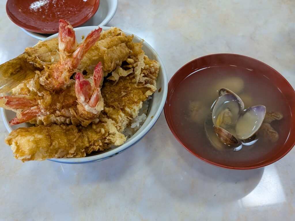 お腹減った勢いで上天丼スペシャル(2400円)と味噌汁(150円)をオーダー