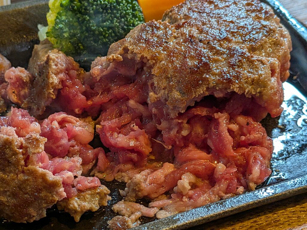 せっかくレアで食べられる牛ハンバークなのでそのままレアでいただきます
