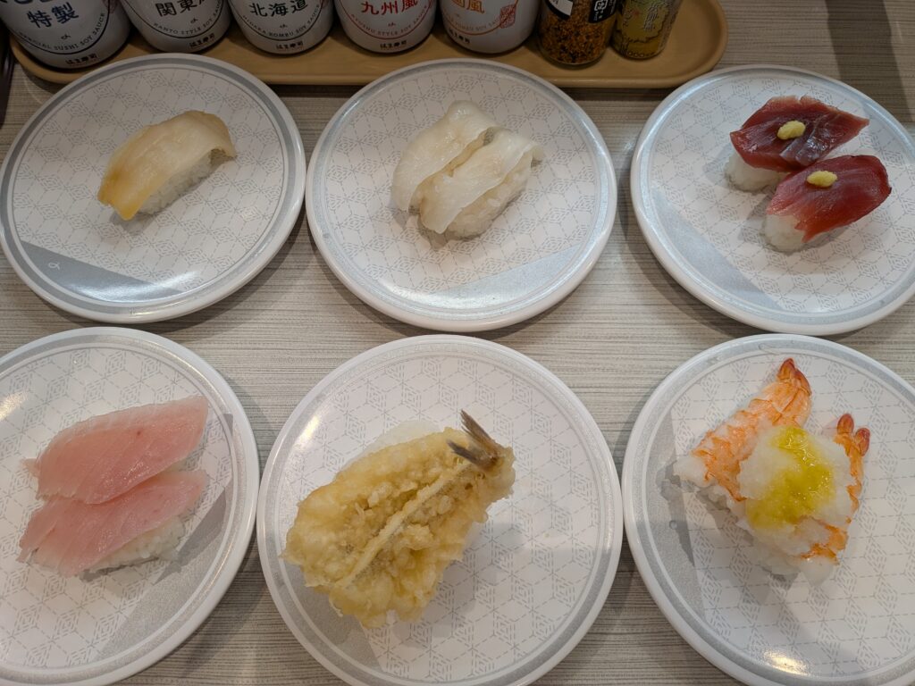 大とろびんちょう(176円)、きすの天ぷら握り(176円)、えびおろし盛り(沖縄県産シークヮーサーだれ 176円)