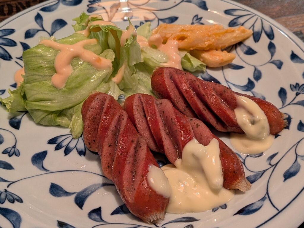 ウインナー炒めはマヨネーズ味でサラダが付いていました