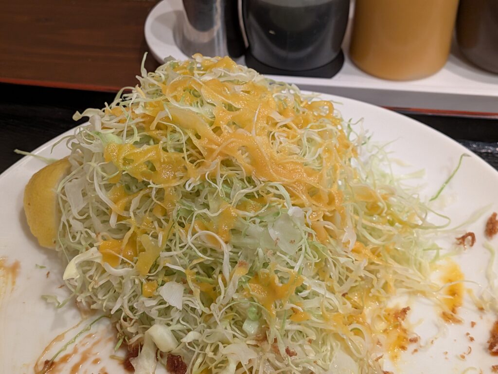 大盛りのキャベツは備え付けのドレッシングで頂きましたが